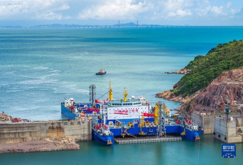 “一航津安1”號沉管運輸安裝一體船拖帶E23管節(jié)和最終接頭從珠海桂山島啟航,前往沉放水域(6月8日攝,無人機照片)。