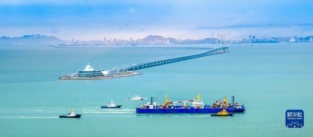 “一航津安1”號沉管運輸安裝一體船將E23管節(jié)和最終接頭浮運至安裝現(xiàn)場時經(jīng)過港珠澳大橋(6月8日攝,無人機照片)。