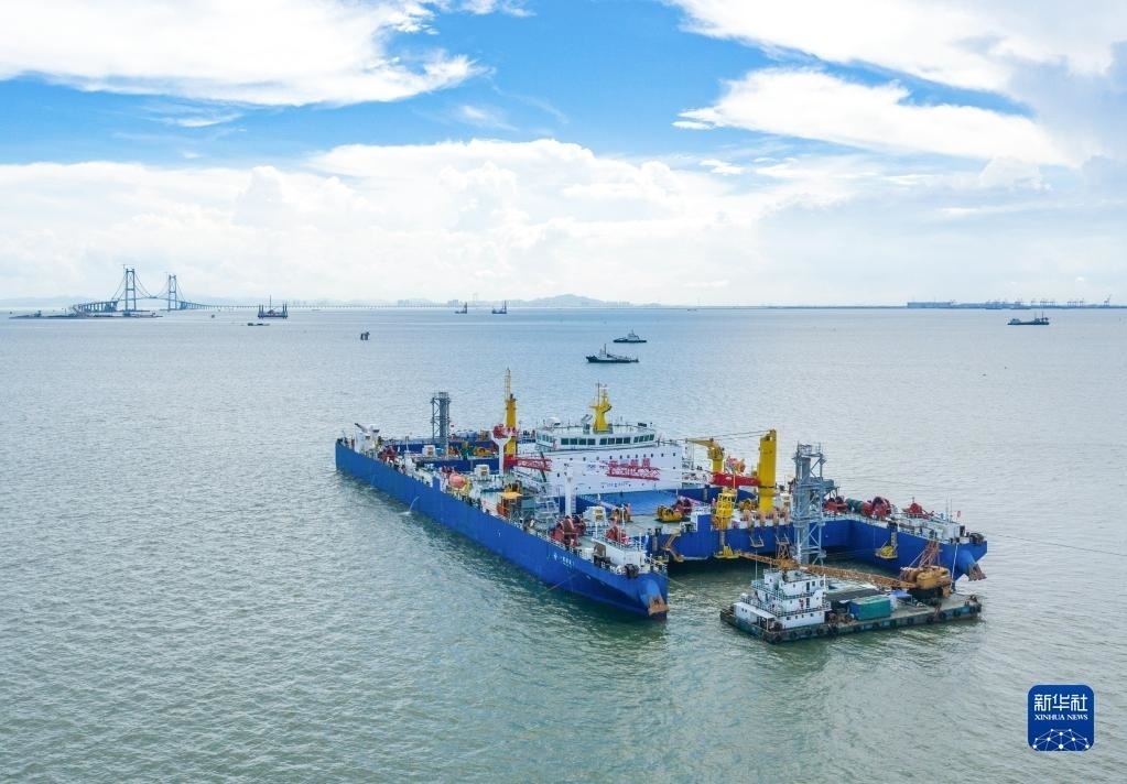 “一航津安1”號沉管運輸安裝一體船在沉放安裝E23管節(jié)和最終接頭,背后是建設中的深中通道伶仃洋大橋(6月9日攝,無人機照片)。