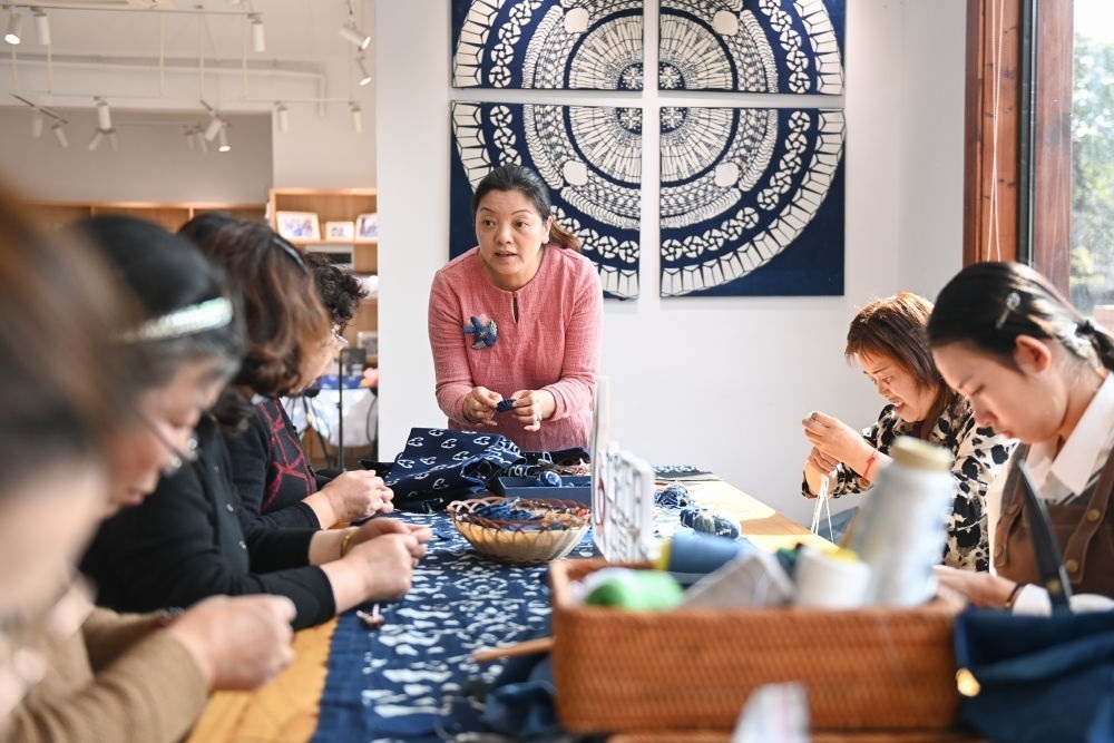 在奉化區(qū)西塢街道雷山村“七彩巧婦”共富工坊,寧波市非物質(zhì)文化遺產(chǎn)藍(lán)印花布印染技藝代表性傳承人張劍峰(中)向村民演示手工飾品的制作方法(2023年3月8日攝)。新華社記者 黃宗治 攝