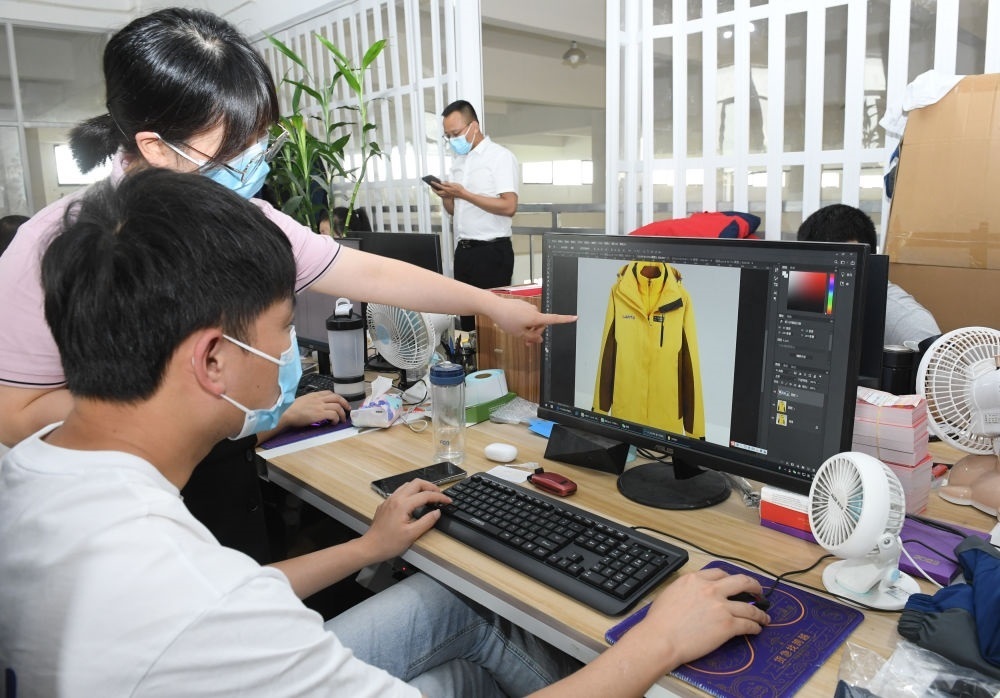 在浙江省臺州市三門縣的一家戶外用品企業(yè),工作人員在討論一款沖鋒衣的設(shè)計(2022年6月14日攝)。新華社記者 翁忻旸 攝