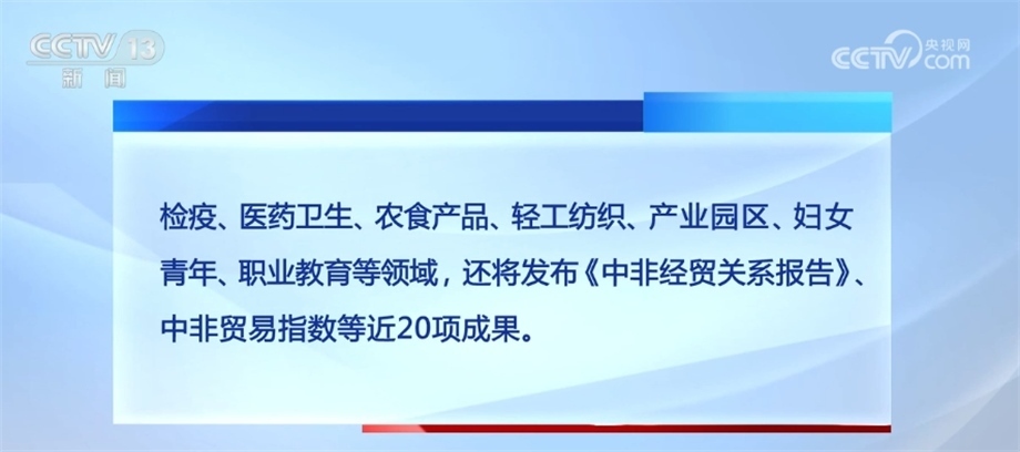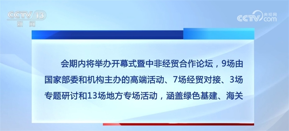 會期內將舉辦開幕式暨中非經貿合作論壇,9場由國家部委和機構主辦的高端活動、7場經貿對接、3場專題研討和13場地方專場活動,涵蓋綠色基建、海關檢疫、醫(yī)藥衛(wèi)生、農食產品、輕工紡織、產業(yè)園區(qū)、婦女青年、職業(yè)教育等領域,還將發(fā)布《中非經貿關系報告》、中非貿易指數等近20項成果。