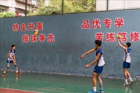 隨著下課鈴聲響起,學(xué)生們紛紛跑到操場上活動。操場一側(cè)是學(xué)校的排球訓(xùn)練館,二十幾名排球少年正在這里揮汗如雨地進(jìn)行著每天的排球訓(xùn)練。目前,該校男排隊有8名隊員入選本屆四川省青年男排集訓(xùn)隊。