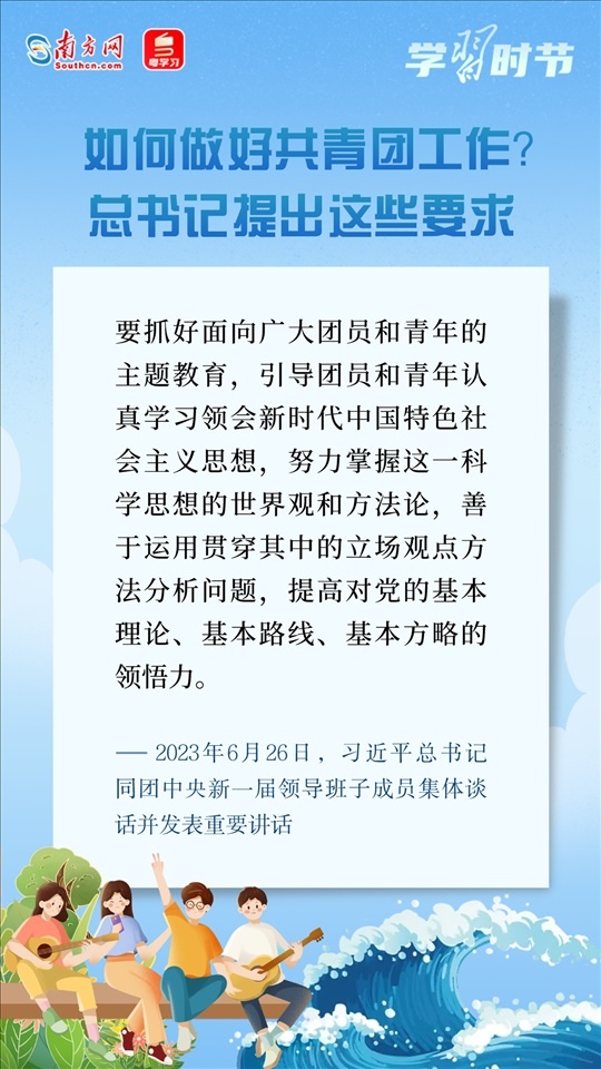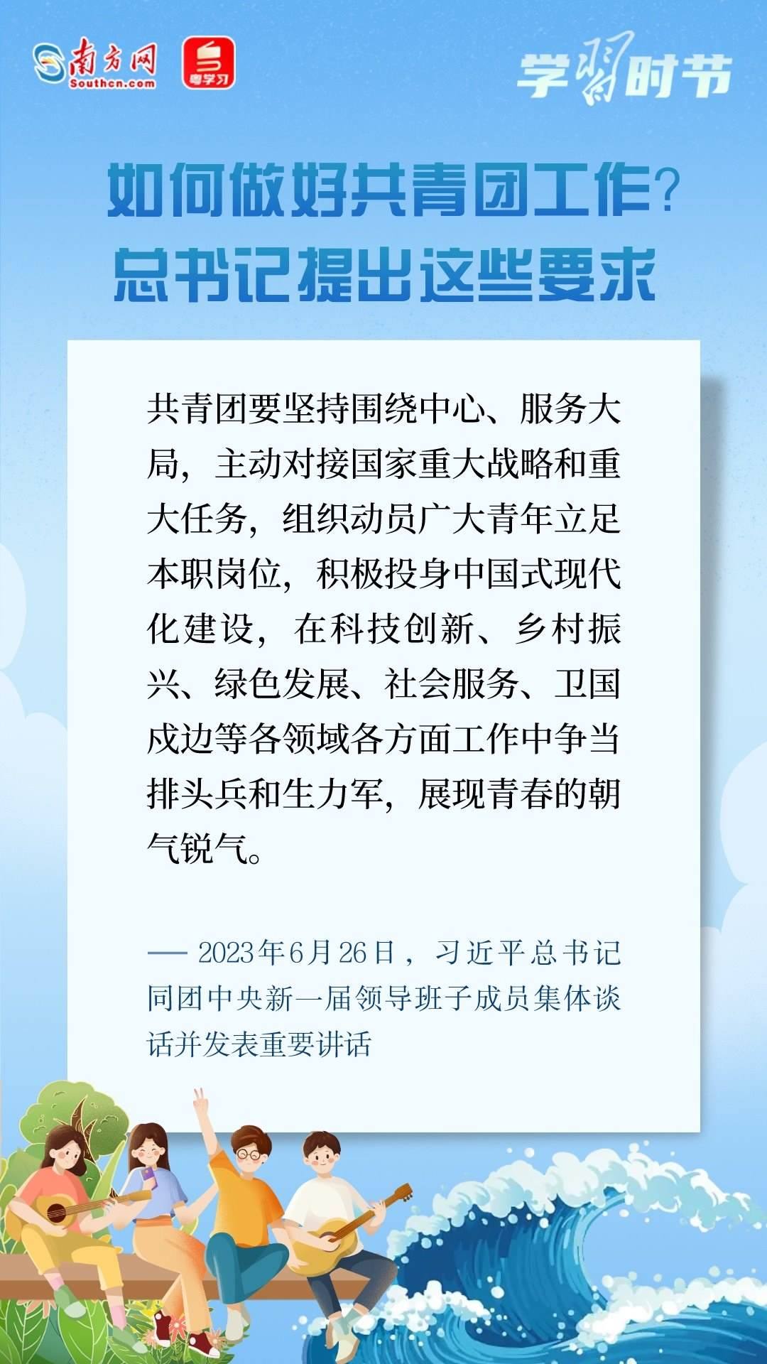 6月26日,習近平總書記同團中央新一屆領導班子成員集體談話并發(fā)表重要講話??倳洀娬{,黨和國家事業(yè)的希望寄托在青年身上。希望共青團中央深入貫徹黨中央要求,切實肩負起新時代新征程黨賦予的使命任務,傳承弘揚優(yōu)良傳統(tǒng),堅持改革創(chuàng)新,更好把青年一代團結凝聚在黨的周圍,為推進強國建設、民族復興偉業(yè)接續(xù)奮斗。