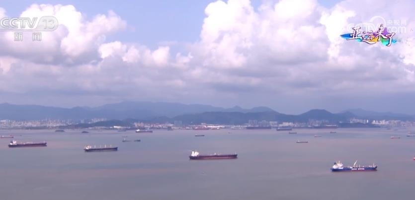 我們飛越兩座亞運場館,將要看到的就是寧波最閃亮的名片之一:寧波舟山港。繁忙是這座港口的常態(tài)。當我們的直升機遠遠地飛行,還沒有靠近港口的時候,就能先看到港口外的這片海域——洋小貓水域,這里是船舶經南航道進出寧波舟山港核心港區(qū)的一條必經之路。向下看,大家可以看到海面上星星點點的船只,來自全球各地滿載商品貨物的遠洋船舶在這里交匯。