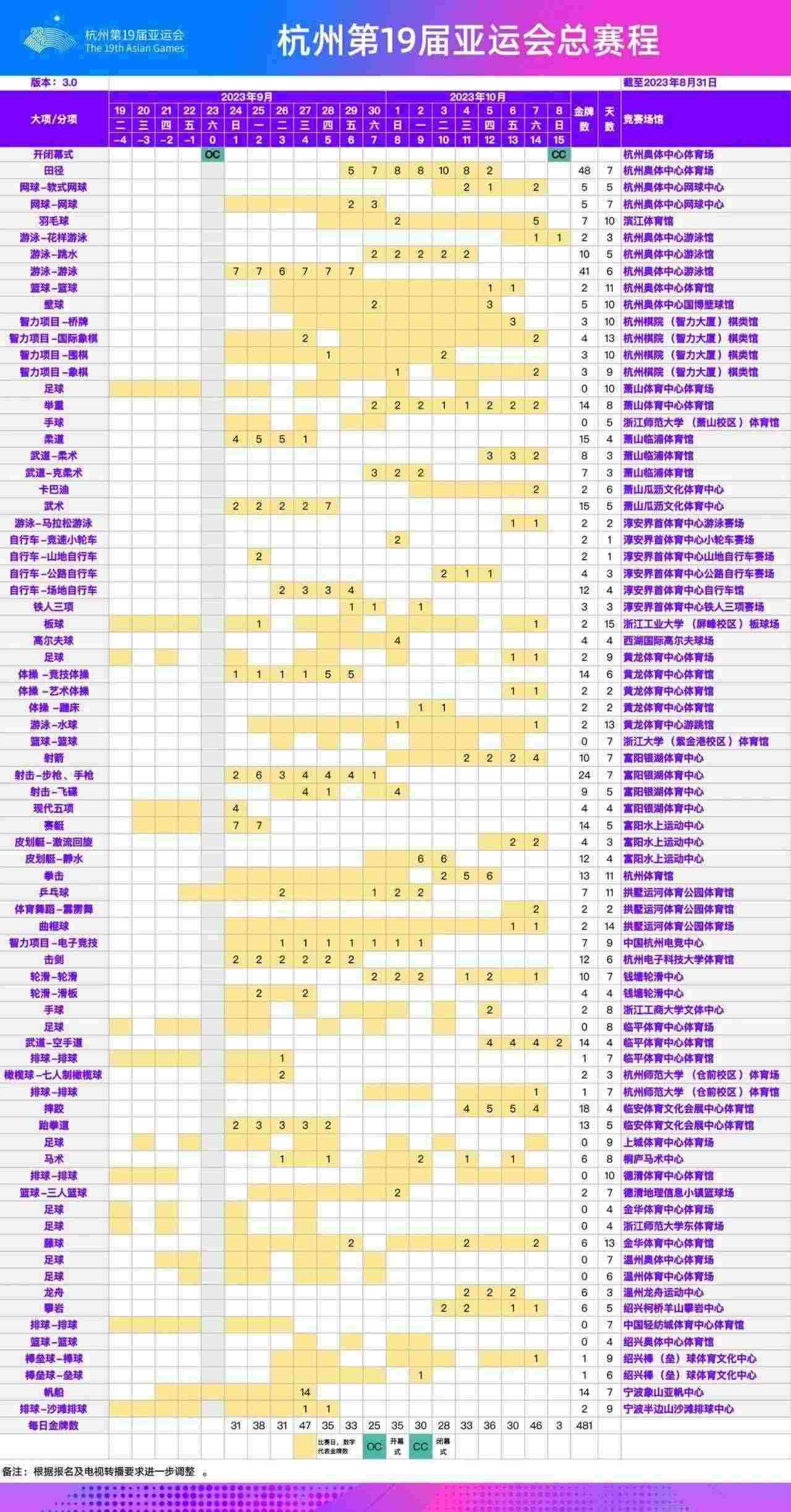 根據(jù)最新報名調(diào)整情況,經(jīng)杭州亞運會各項目技術(shù)代表確認,杭州亞運會總賽程已更新至3.0版。