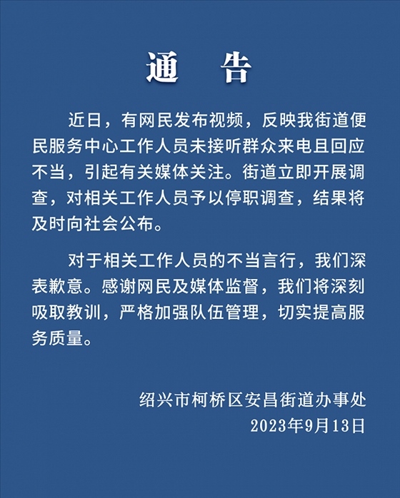 ·浙江紹興有市民發(fā)視頻稱(chēng),打不通安昌便民中心電話(huà),來(lái)到現(xiàn)場(chǎng)發(fā)現(xiàn)工作人員都在聊天,吐槽電話(huà)是擺設(shè)。官方通報(bào):相關(guān)工作人員停職調(diào)查。