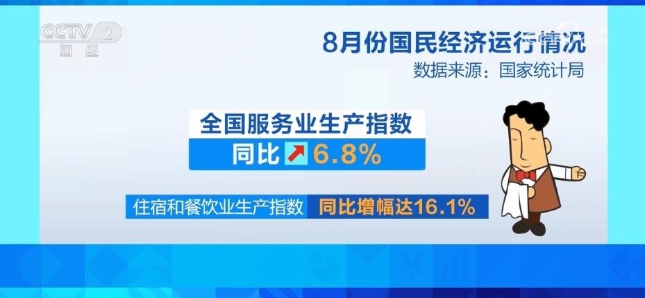 服務(wù)業(yè)較快增長,8月份,全國服務(wù)業(yè)生產(chǎn)指數(shù)同比增長6.8%。其中,住宿和餐飲業(yè)依然保持較快增長,生產(chǎn)指數(shù)同比增幅達(dá)到16.1%。