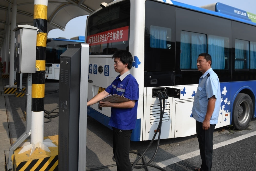 工作人員(左)在杭州公交電車公司拱康路維保站檢查純電動(dòng)公交車的充電情況。新華社記者黃宗治 攝