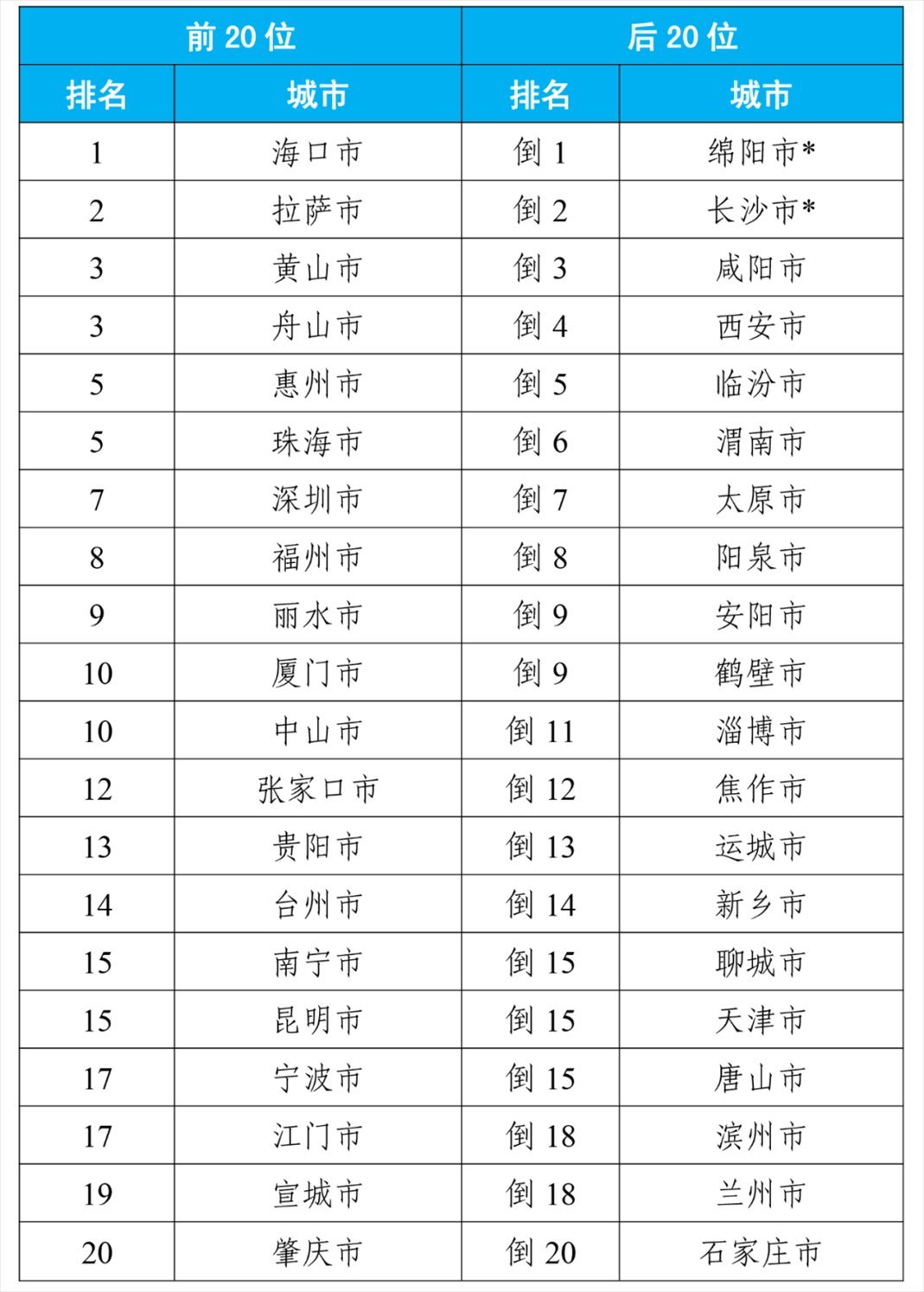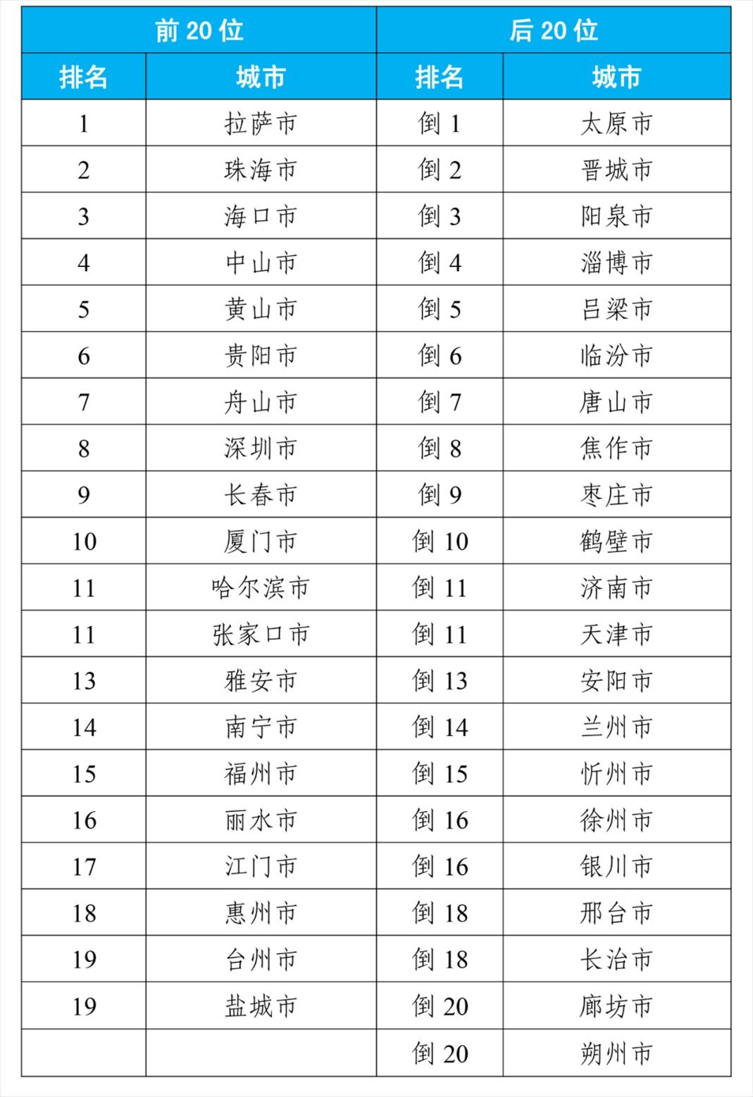8月,168個重點(diǎn)城市中,空氣質(zhì)量排名前20位城市依次是拉薩、珠海和海口等城市(從第1名至并列第19名);空氣質(zhì)量排名后20位城市依次是太原、晉城和陽泉等城市(從倒數(shù)第1名至并列倒數(shù)第20名)。見附表1。