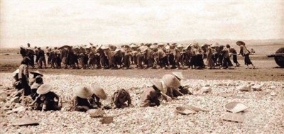 △抗戰(zhàn)期間,中國民工手搬石塊、肩拉石碾修筑機場。(資料圖片)
