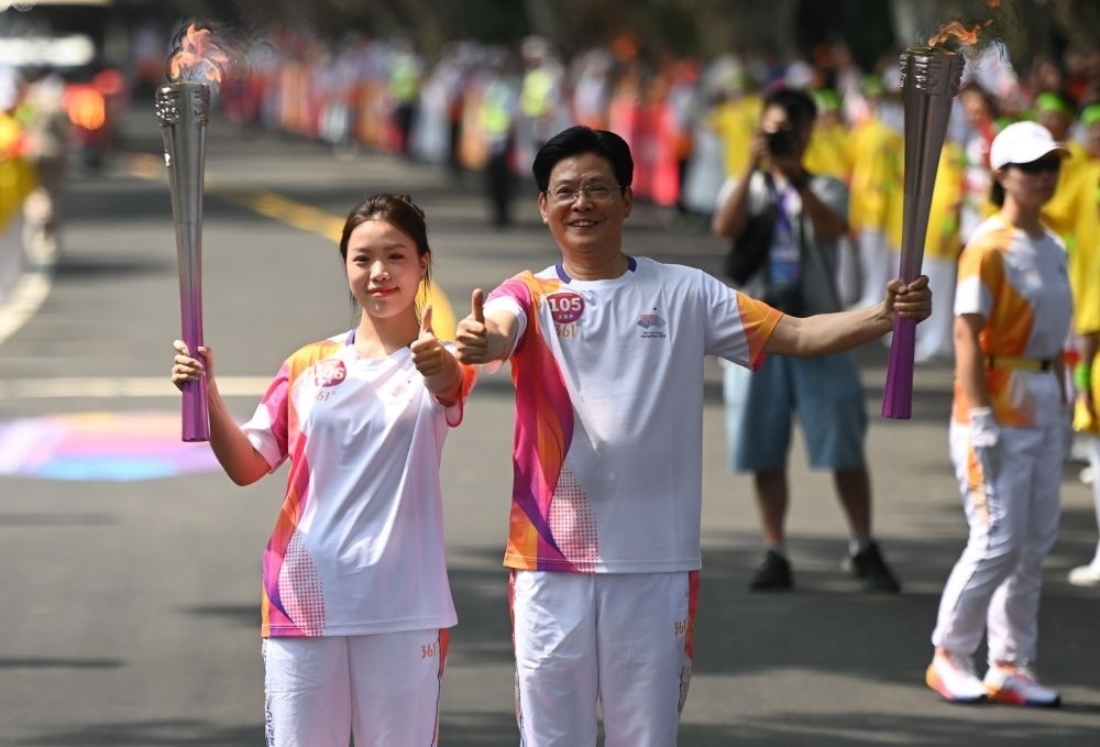↑火炬手鄭方(右)和施金仙在火炬?zhèn)鬟f中。