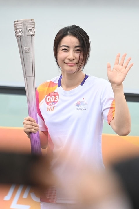 ↑火炬手司燁儀在火炬?zhèn)鬟f中。