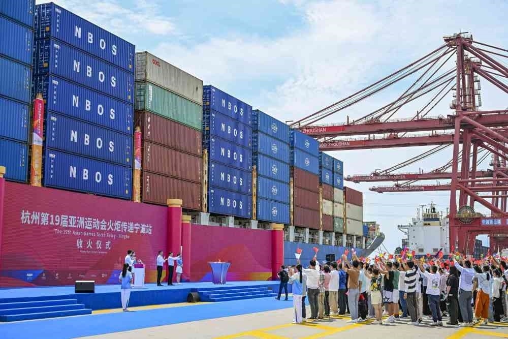 ↑這是杭州亞運(yùn)會(huì)火炬?zhèn)鬟f寧波站收火儀式現(xiàn)場(chǎng)。