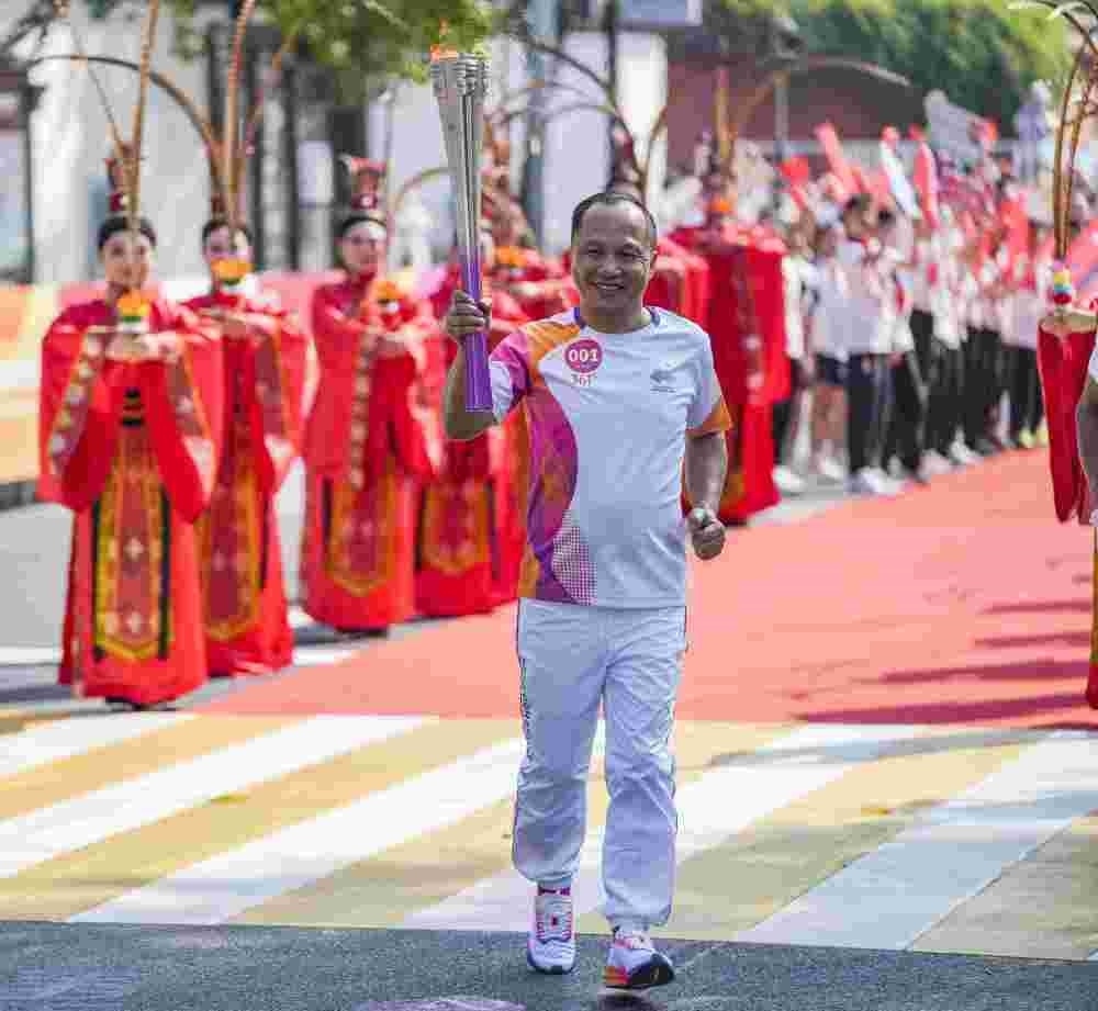 ↑火炬手鄭欽文在火炬?zhèn)鬟f中。