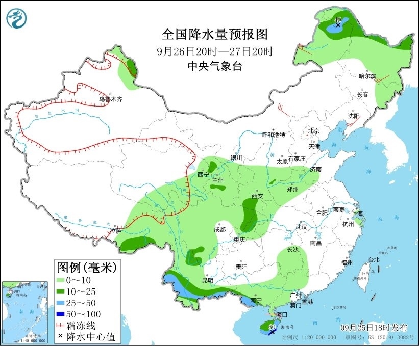 9月25日20時(shí)至26日20時(shí),廣東西南部、廣西南部、海南島以及新疆北疆北部、西藏東南部、陜西南部等地部分地區(qū)有中到大雨,其中,海南島東部和南部等地部分地區(qū)有暴雨或大暴雨(100~180毫米)。另外,新疆阿勒泰山區(qū)有雨夾雪或雪。內(nèi)蒙古中西部、山東半島等地部分地區(qū)有4~6級(jí)風(fēng)(見(jiàn)圖1)。