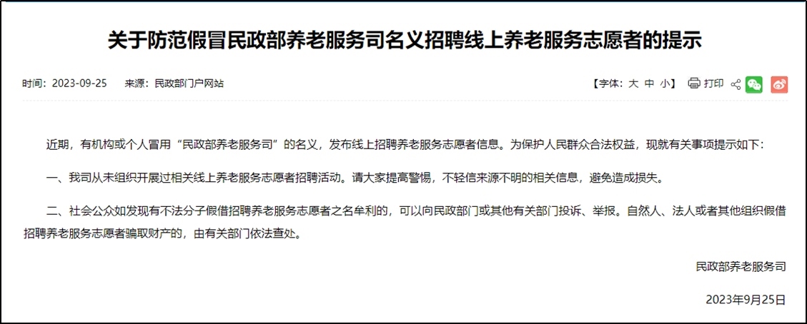·有機構(gòu)或個人冒用“民政部養(yǎng)老服務(wù)司”名義招聘志愿者,民政部發(fā)布提示。