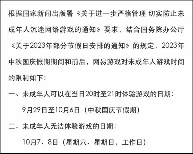 ·多個游戲平臺發(fā)布中秋國慶假期未成年人游戲限時通知。