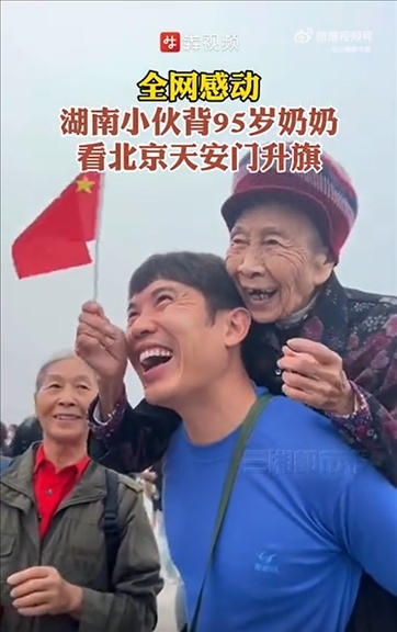 近日,湖南一名男子背著95歲的奶奶,從永州出發(fā)到北京天安門看升國旗。看著五星紅旗冉冉升起,祖孫兩人露出了幸福的笑容。網(wǎng)友:這是“最美的風(fēng)景”。