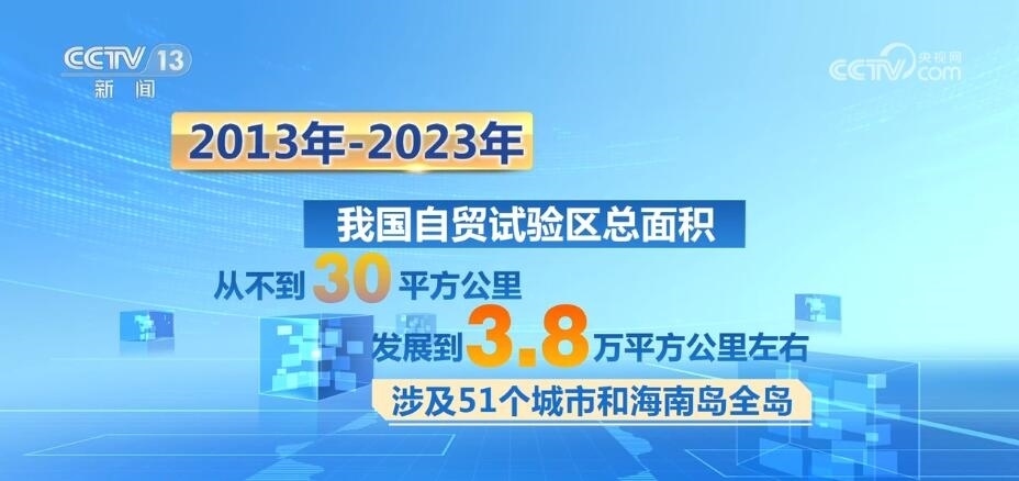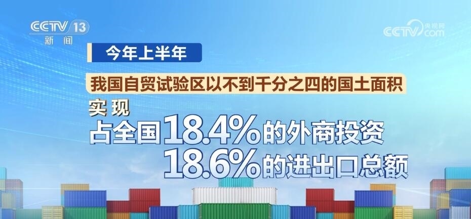 十年間,我國(guó)自貿(mào)試驗(yàn)區(qū)的總面積從不到30平方公里發(fā)展到3.8萬(wàn)平方公里左右,涉及51個(gè)城市和海南島全島。今年上半年,我國(guó)自貿(mào)試驗(yàn)區(qū)以不到千分之四的國(guó)土面積,實(shí)現(xiàn)了占全國(guó)18.4%的外商投資和18.6%的進(jìn)出口總額,帶動(dòng)全國(guó)形成了覆蓋東西南北中、統(tǒng)籌沿海內(nèi)陸沿邊的改革開(kāi)放創(chuàng)新格局。