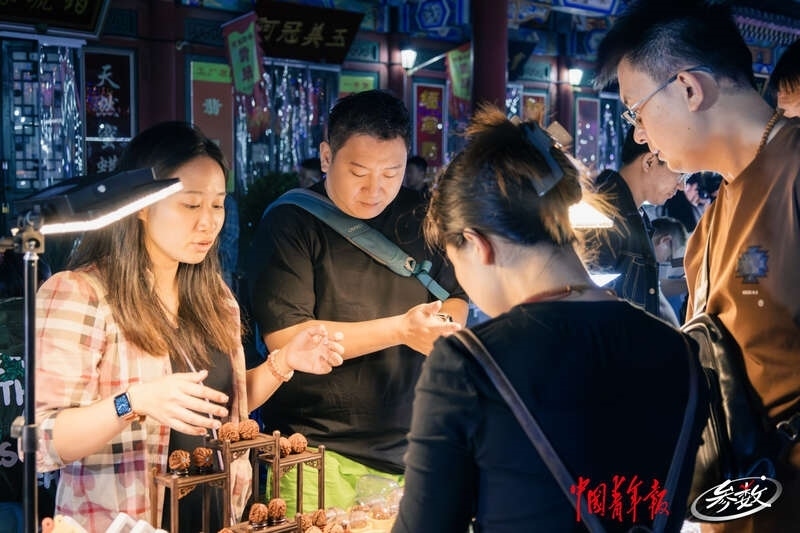 夜幕降臨,北京潘家園舊貨市場內(nèi)的周三夜場開啟,攤位上亮起了一盞盞照明的小燈,很多年輕人正在攤位前選購商品。實習(xí)生 邱嵐/攝