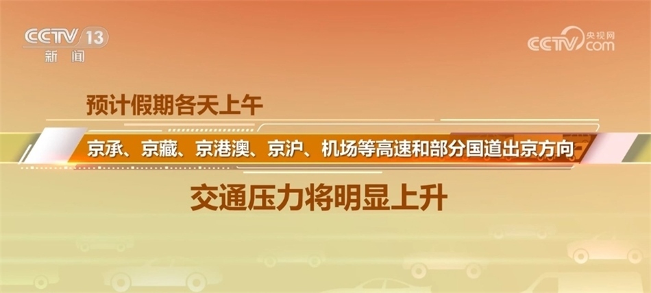 北京市交通部門(mén)表示,“雙節(jié)”假日期間,高速公路小客車(chē)免費(fèi)通行、尾號(hào)不限行等措施帶動(dòng)群眾出行需求集中釋放,預(yù)計(jì)中超、中網(wǎng)、演出等大型活動(dòng)舉辦場(chǎng)地周邊道路短時(shí)車(chē)流集中,連接城區(qū)和郊區(qū)的各條高速公路將出現(xiàn)上午出京、下午進(jìn)京的車(chē)流高峰,預(yù)計(jì)假期各天上午,京承、京藏、京港澳、京滬、機(jī)場(chǎng)等高速和部分國(guó)道出京方向的交通壓力將明顯上升。