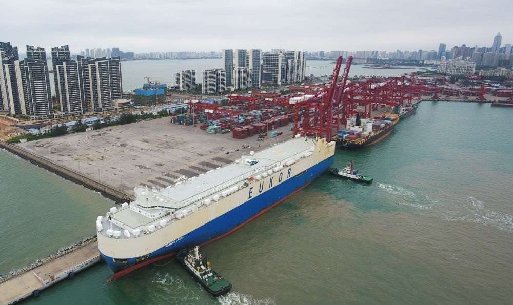 2020年2月16日,滾裝貨船“勞拉”輪駛?cè)牒?谛阌⒏郏o(wú)人機(jī)照片)。這是海南自貿(mào)區(qū)政策實(shí)施后的首艘汽車外貿(mào)船。新華社記者 楊冠宇 攝