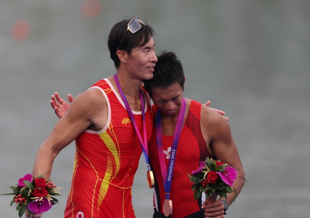 9月25日,冠軍中國選手張亮(左)與季軍中國香港選手趙顯臻在男子單人雙槳頒獎儀式后擁抱致意。