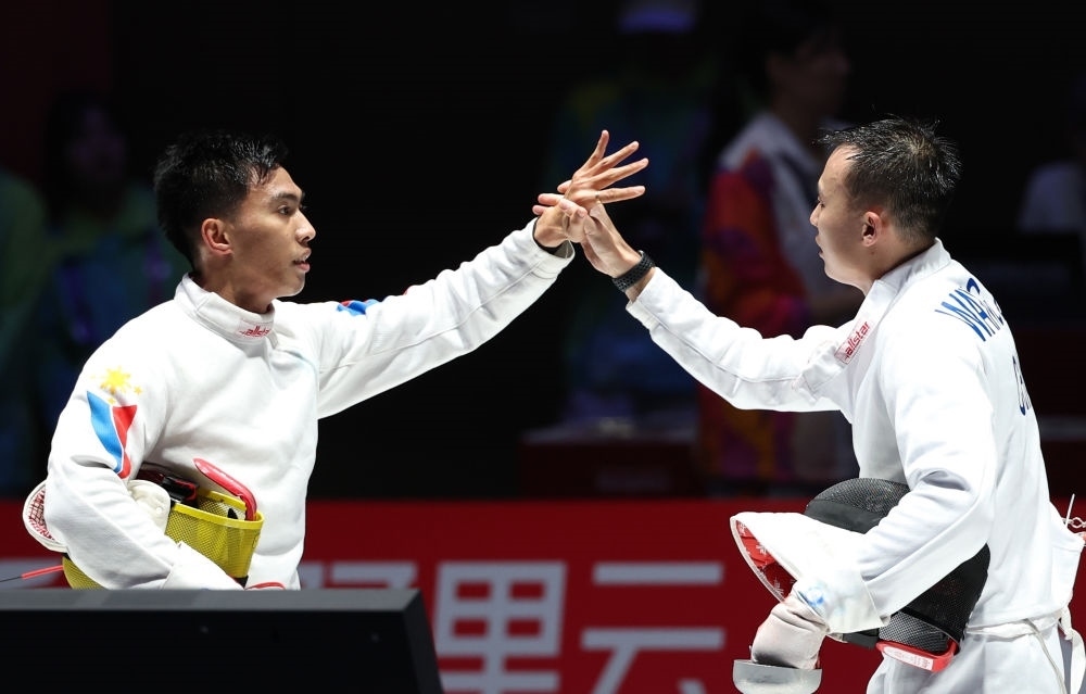 ?9月26日,中國選手王子杰(右)在男子個人重劍八分之一決賽賽后與菲律賓選手諾埃利托·何塞致意。
