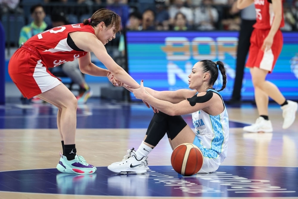 9月29日,日本隊球員宮崎早織(左)在籃球女子預(yù)賽B組比賽中拉起哈薩克斯坦隊球員阿納斯塔西婭·阿利紹斯凱特·洛帕京娜。
