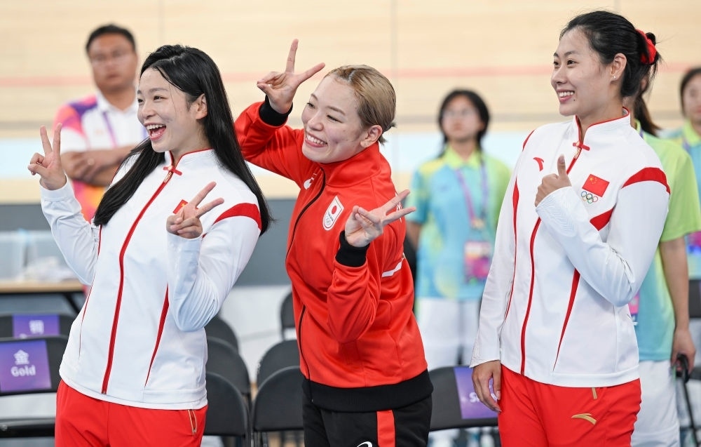 9月27日,冠軍日本選手佐藤水菜(中)、亞軍中國選手王麗娟(左)、季軍中國選手張琳茵在場地自行車女子凱林賽頒獎等候區(qū)合影。