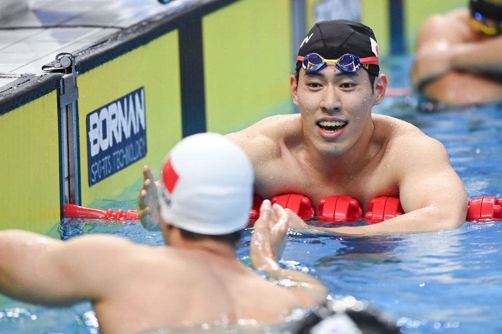 9月28日,中國隊選手在男子4X100米自由泳接力決賽后與韓國隊和日本隊選手致意。