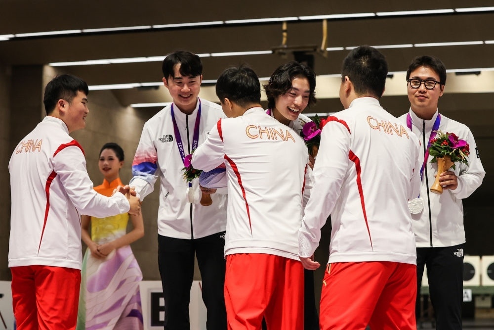 9月25日,冠軍中國隊選手李越宏(左三)、劉楊攀(左一)、王鑫杰(右二)在男子25米手槍速射團體頒獎儀式上向亞軍韓國隊致意。