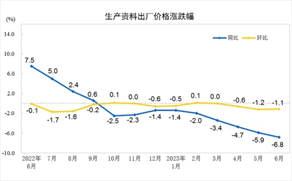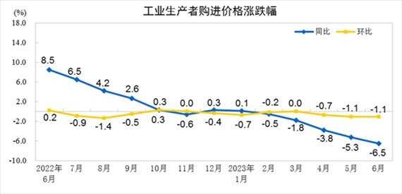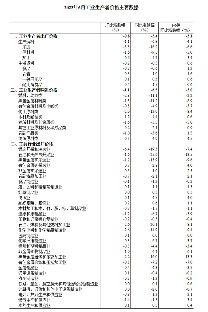 央視網(wǎng)消息:據(jù)國(guó)家統(tǒng)計(jì)局網(wǎng)站消息,2023年6月份,全國(guó)工業(yè)生產(chǎn)者出廠價(jià)格同比下降5.4%,環(huán)比下降0.8%;工業(yè)生產(chǎn)者購(gòu)進(jìn)價(jià)格同比下降6.5%,環(huán)比下降1.1%。上半年,工業(yè)生產(chǎn)者出廠價(jià)格比上年同期下降3.1%,工業(yè)生產(chǎn)者購(gòu)進(jìn)價(jià)格下降3.0%。