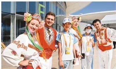 近日,上海合作組織國際投資貿(mào)易博覽會在青島舉行,促進了國際間科技、經(jīng)濟和文化交流。圖為來自白俄羅斯的客人與博覽會志愿者合影。
