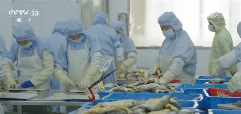 總臺央視記者 馬寧:我現(xiàn)在來到了寧德市當?shù)匾患冶容^大的黃魚生產(chǎn)企業(yè),大家可以看到我身后就是工人們正在把已經(jīng)腌制好的黃魚經(jīng)過分撿、稱重、打包、送進冷庫,這些經(jīng)過處理的大黃魚就可以通過冷鏈物流送到千家萬戶的餐桌上。