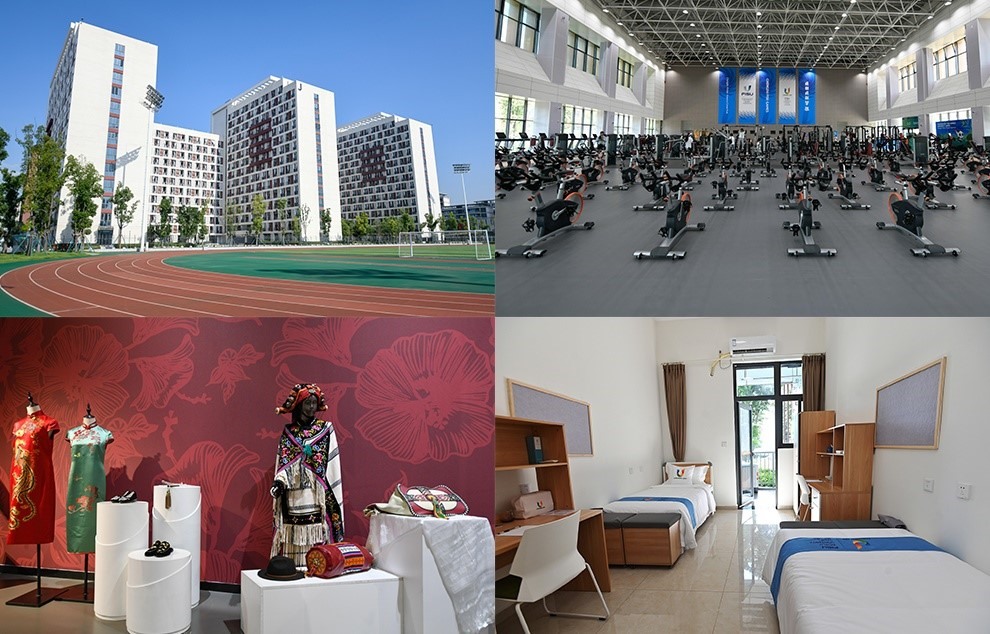 △左上圖是大運村一處代表團公寓。右上圖是大運村健身中心的器械區(qū)。左下圖是大運村展覽中心內的特色服飾展區(qū)。右下圖是大運村一間運動員宿舍。