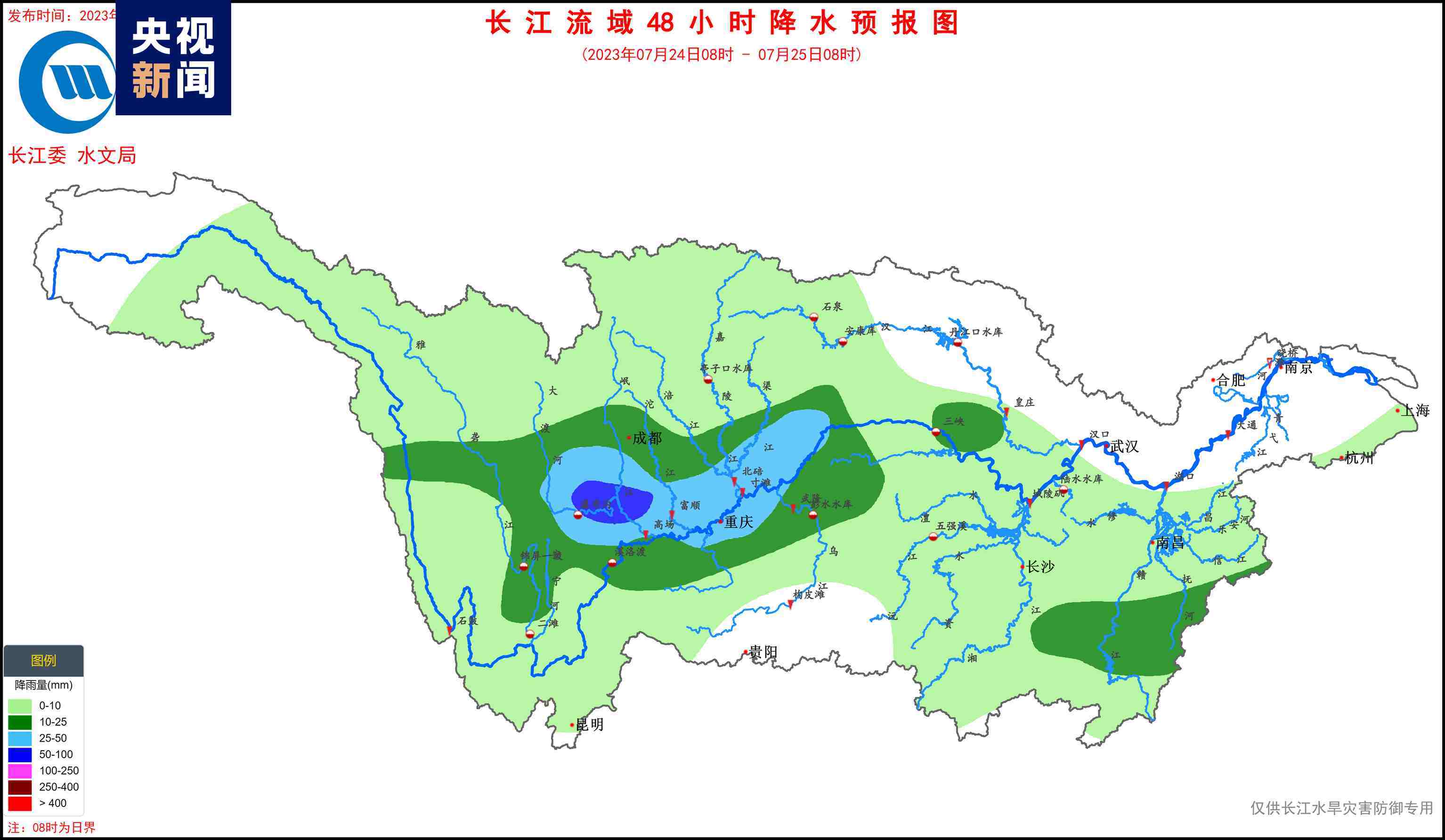 據(jù)水文氣象預(yù)報(bào),7月23日,嘉岷流域北部有中雨、局地大雨;24~27日,長(zhǎng)江上游干流附近有中到大雨、局地暴雨的降水過(guò)程,過(guò)程累計(jì)面雨量:長(zhǎng)江上游干流70毫米,金沙江中下游、雅礱江、岷沱江、渠江、烏江上游30~50毫米??紤]預(yù)見(jiàn)期降雨,金沙江中下游、嘉岷流域、赤水河、烏江、三峽區(qū)間將發(fā)生漲水過(guò)程,降雨落區(qū)內(nèi)部分中小河流可能發(fā)生超警洪水,局部強(qiáng)降雨引發(fā)山洪災(zāi)害的風(fēng)險(xiǎn)高。