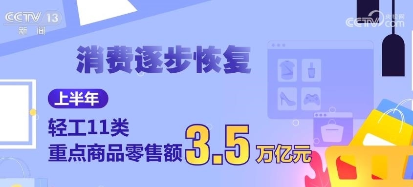 消費(fèi)逐步恢復(fù)。上半年,輕工11類重點(diǎn)商品零售額3.5萬億元,占社會(huì)消費(fèi)品零售總額的15.4%,同比增長(zhǎng)6.3%。