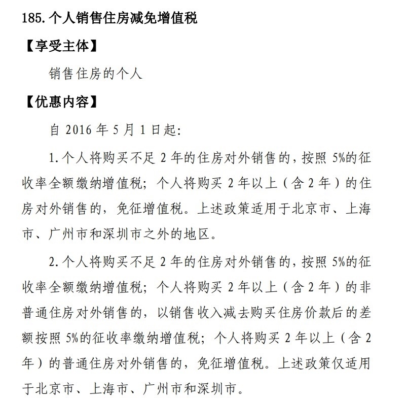 目前市場比較關(guān)心的內(nèi)容包括:個(gè)人銷售住房減免增值稅、個(gè)人轉(zhuǎn)讓自用家庭唯一生活用房免征個(gè)人所得稅、個(gè)人購買家庭唯一住房或第二套改善性住房減征契稅、居民換購住房退還個(gè)人所得稅等。