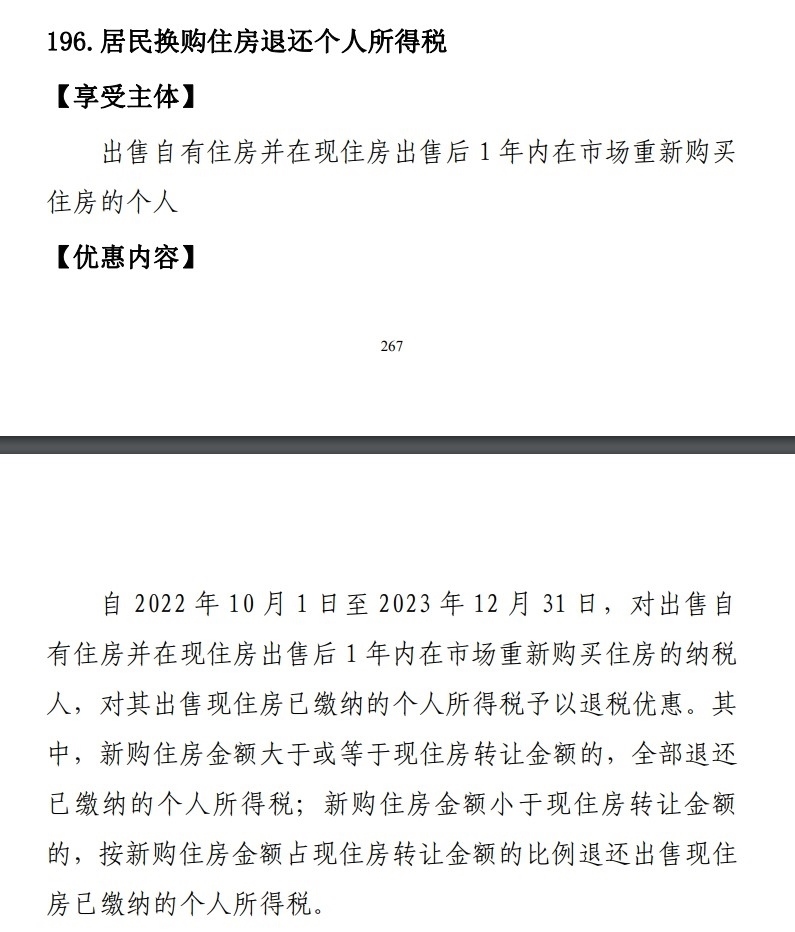 居民換購住房退還個(gè)人所得稅政策也已于2022年發(fā)布。按照規(guī)定,自2022年10月1日至2023年12月31日,對出售自有住房并在現(xiàn)住房出售后1年內(nèi)在市場重新購買住房的納稅人,對其出售現(xiàn)住房已繳納的個(gè)人所得稅予以退稅優(yōu)惠。其中,新購住房金額大于或等于現(xiàn)住房轉(zhuǎn)讓金額的,全部退還已繳納的個(gè)人所得稅;新購住房金額小于現(xiàn)住房轉(zhuǎn)讓金額的,按新購住房金額占現(xiàn)住房轉(zhuǎn)讓金額的比例退還出售現(xiàn)住房已繳納的個(gè)人所得稅。