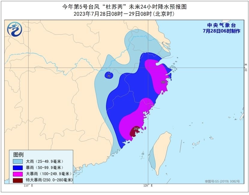 降水預(yù)報(bào):28日08時(shí)至29日08時(shí),江蘇南部、安徽南部、浙江、福建、江西東部、臺(tái)灣島西南部等地的部分地區(qū)有大到暴雨,其中,浙江北部和東部、福建東部等地的部分地區(qū)有大暴雨,局地特大暴雨(250-280毫米)。
