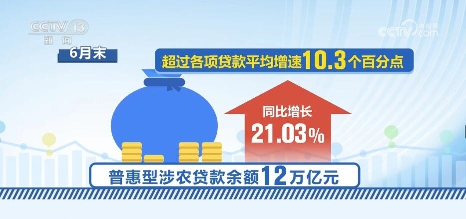 上半年,涉農貸款余額也保持較快增長。6月末,全國涉農貸款余額54.64萬億元,同比增長16.0%。其中,普惠型涉農貸款余額12萬億元,同比增長21.03%,超過各項貸款平均增速10.3個百分點。