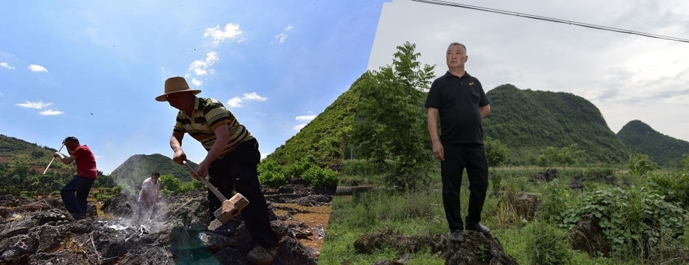 拼版照片:左圖為2008年劉登榮帶領(lǐng)村民一起改造石漠化土地的資料照片(西疇縣融媒體中心供圖);右圖為2023年7月27日,劉登榮站在改造好的臺(tái)地上留影(新華社記者 費(fèi)茂華 攝)。