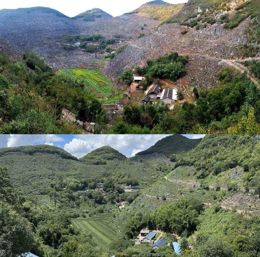 拼版照片:上圖為1991年拍攝的西疇縣大鄔麻村改造前的石漠化情況(西疇縣融媒體中心供圖);下圖為2023年7月26日拍攝的西疇縣大鄔麻村改造后的情況(新華社記者 費(fèi)茂華 攝)。