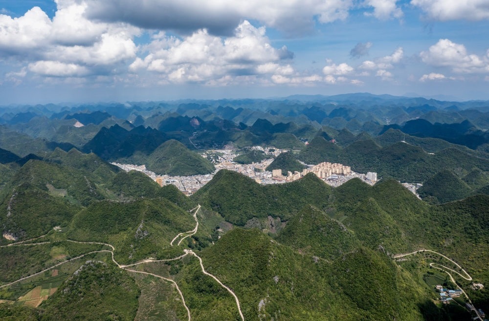這是7月26日拍攝的西疇縣山間公路一景,遠(yuǎn)處是縣城。新華社記者 陳欣波 攝