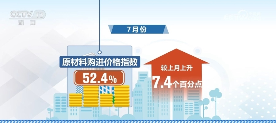 7月份,原材料購進價格指數(shù)為52.4%,較上月上升7.4個百分點,結(jié)束了連續(xù)三個月運行在50%以下的勢頭。制造業(yè)生產(chǎn)用原材料價格總體水平有所上升。