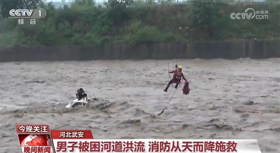 7月30日下午,河北武安一男子駕車涉水過橋時,被湍急的洪水沖入洺河河道近百米,救援人員接警后立即趕往現場。從現場情況看,因水流過于湍急,被困車輛隨急流翻滾,洪流一度沒過車頂?,F場指揮員隨即協調起吊車等工程車輛協助進行救援,最終經過1小時20分的驚險救援,被困男子成功獲救。