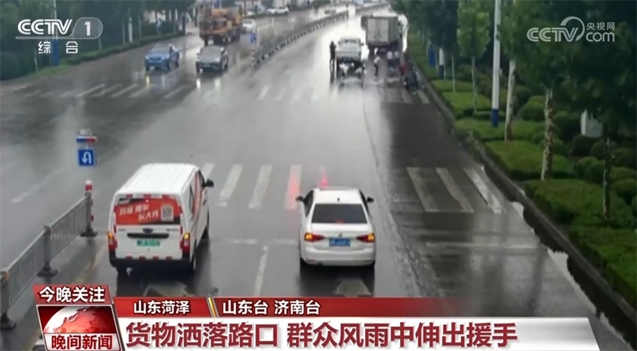 近日,山東菏澤定陶區(qū)出現持續(xù)強降雨過程,因雨天路滑,一輛載滿貨物的車輛轉彎時,車上裝載的一噸多礦泉水灑落一地,風大雨急,貨車司機束手無策。這時,又一輛貨車停在了車前,從車上下來三位女士幫助貨車司機搬運貨物,過往群眾也紛紛冒雨參與其中。在大家共同努力下,灑落的貨物十分鐘就被整理干凈。