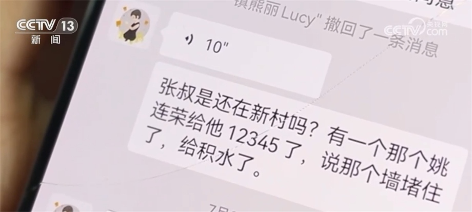 熊麗生前的微信語音:宗叔,是還在新村嗎?有一個姚連榮打12345了,說那個墻堵住了,給積水了。